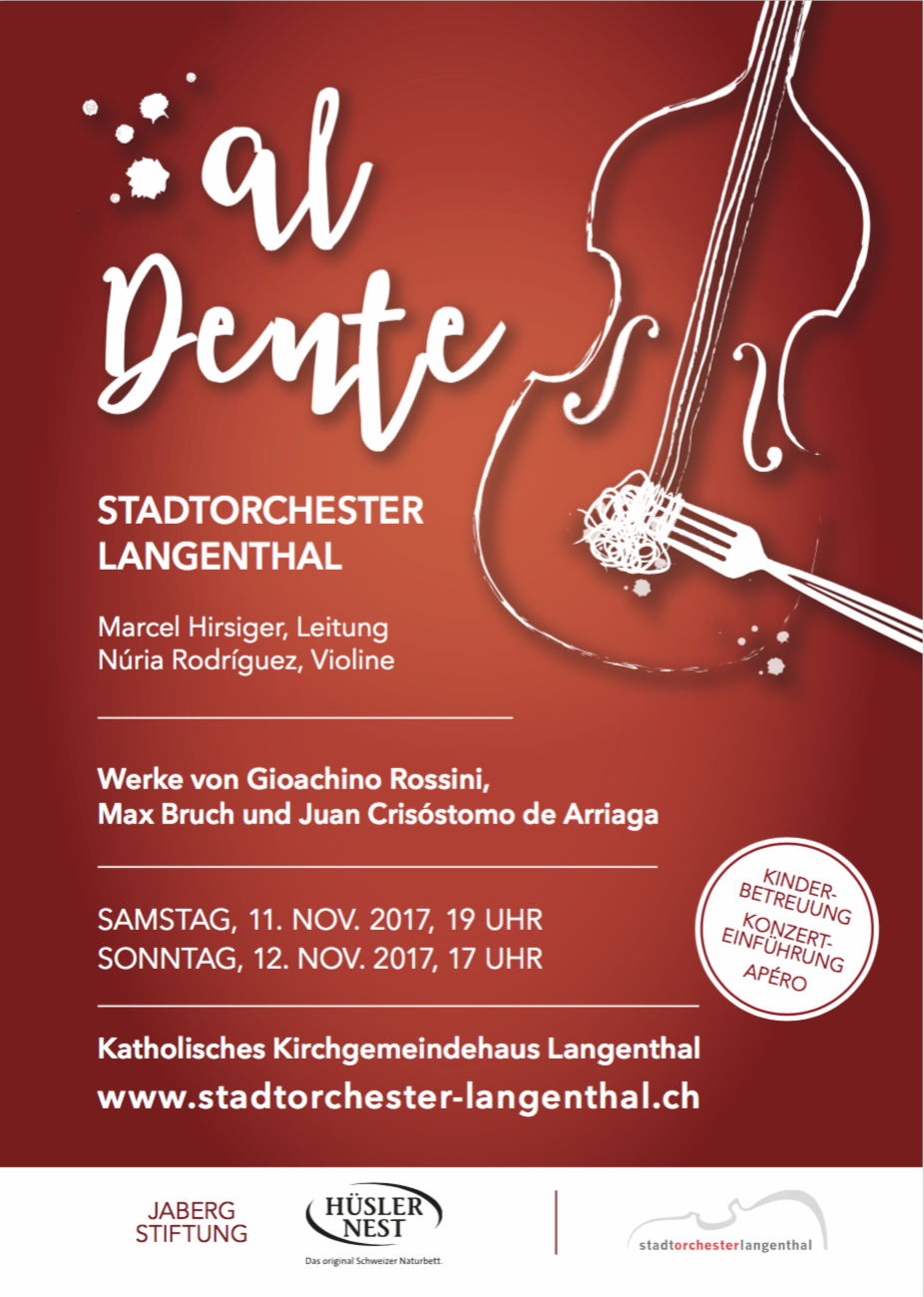 Das Stadtorchester Langenthal lädt am 11. und 12. November 2017 zu einem romantischen und „bissfesten“ Konzertprogramm unter der Leitung seines Dirigenten, Marcel Hirsiger, ein. Im Zentrum steht das berühmte Violinkonzert von Max Bruch mit der Langenthaler Geigerin Núria Rodríguez als Solistin. Neu gibt es eine kommentierte Konzerteinführung und eine Kinderbetreuung.
